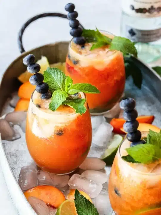 Beat the heat with minty Gingered Peach and Blueberry Mojitos! A refreshingly flavorful twist to the classic cocktail. Light, fruity, and yeah, a little boozy!