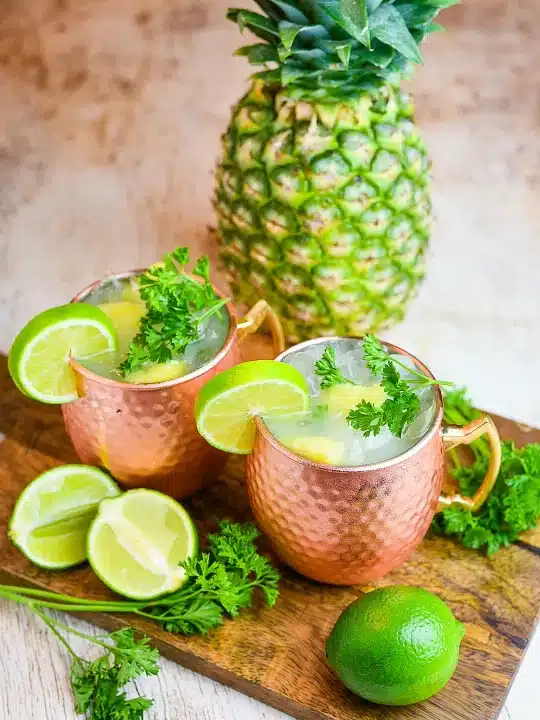 The natural flavors from the fresh pineapple chunks and fresh cilantro really turn this Pineapple Coconut Moscow Mule into a refreshing anytime drink.