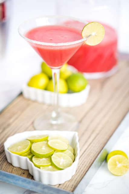 Watermelon chunks and lime juice are blended together for the perfect summer drink! Add Moscato wine for a perfect easy alcoholic punch for adults!